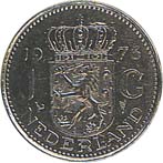| 1 guilder coin, 1973, front and back. Reign (1948-1980) of Queen Juliana (1909-2004). |